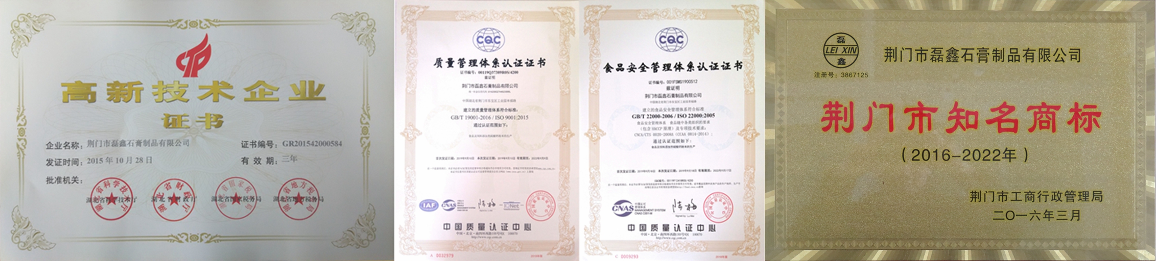 國家高新技術企業(yè)!湖北省專精特新中小企業(yè)!湖北省支柱產(chǎn)業(yè)細分領域隱形冠軍培育企業(yè)!湖北省守合同重信用企業(yè)!湖北省兩化融合示范企業(yè)!荊門市知名商標!中國高純、高白、高亮、超細硫酸鈣(石膏)生產(chǎn)基地!中國取得《食品生產(chǎn)許可證》的食品添加劑硫酸鈣(石膏)供應商!中國取得《飼料添加劑生產(chǎn)許可證》和《產(chǎn)品批準文號》硫酸鈣供應商!中國取得《出口飼料生產(chǎn)、加工、存放企業(yè)檢驗檢疫注冊登記證》飼料添加劑硫酸鈣供應商!通過ISO9001國際質量管理體系認證!通過ISO22000國際食品安全管理體系認證!通過HALAL國際清真認證!通過KOSHER猶太認證! 荊門市磊鑫石膏制品有限公司成立于2002年,位于石膏資源富集的湖北省荊門市東寶區(qū)工業(yè)園幸福路,占地27000余平方米,是一家在業(yè)內(nèi)享有盛譽的集石膏、石膏粉和硫酸鈣制品研發(fā)、生產(chǎn)、銷售于一體的高新技術企業(yè)。公司擁有 “磊鑫”、“杰普生”、“凱氏蘇特”等5個國家注冊商標,2個發(fā)明專利,18個實用新型專利,50余篇自有技術應用研究,36篇權威期刊發(fā)表技術論文。主要產(chǎn)品有:醫(yī)藥級硫酸鈣、食品級硫酸鈣、飼料添加劑硫酸鈣、人造石透明填充粉,凱色粉、涂料及化妝品功能性填料和特級半水纖膏粉、混合石膏粉、模型石膏粉,建筑石膏粉等九大系列50余種產(chǎn)品。公司享有自營進出口權,客戶遍布全世界,是多家公司、集團和世界500強企業(yè)的優(yōu)秀供應商!產(chǎn)品遠銷到韓國、日本、俄羅斯、中國臺灣、東南亞、歐美、中東、非洲等國家和地區(qū)。公司緊靠207國道,焦柳鐵路穿境而過,距漢江碼頭50公里,長江沙市港90公里。交通運輸便利,確保及時供貨。“待用戶為上帝誠信為本,視質量為生命持之以恒!”是我們的企業(yè)宗旨,與我們合作是您明智的選擇,共謀發(fā)展是我們共同的目標!歡迎垂詢,歡迎惠顧! Your Trusted Source For Food-Grade Calcium Sulfate!——做全球更好的食品級硫酸鈣(石膏)供應商! ——CGC·磊鑫石膏